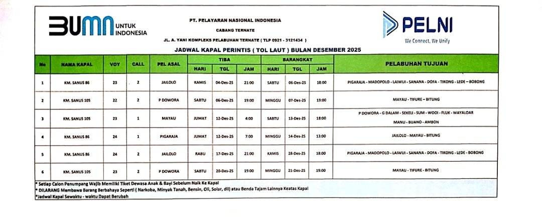 Berikut jadwal resmi keberangkatan kapal perintis dari Ternate sepanjang Desember 2025: