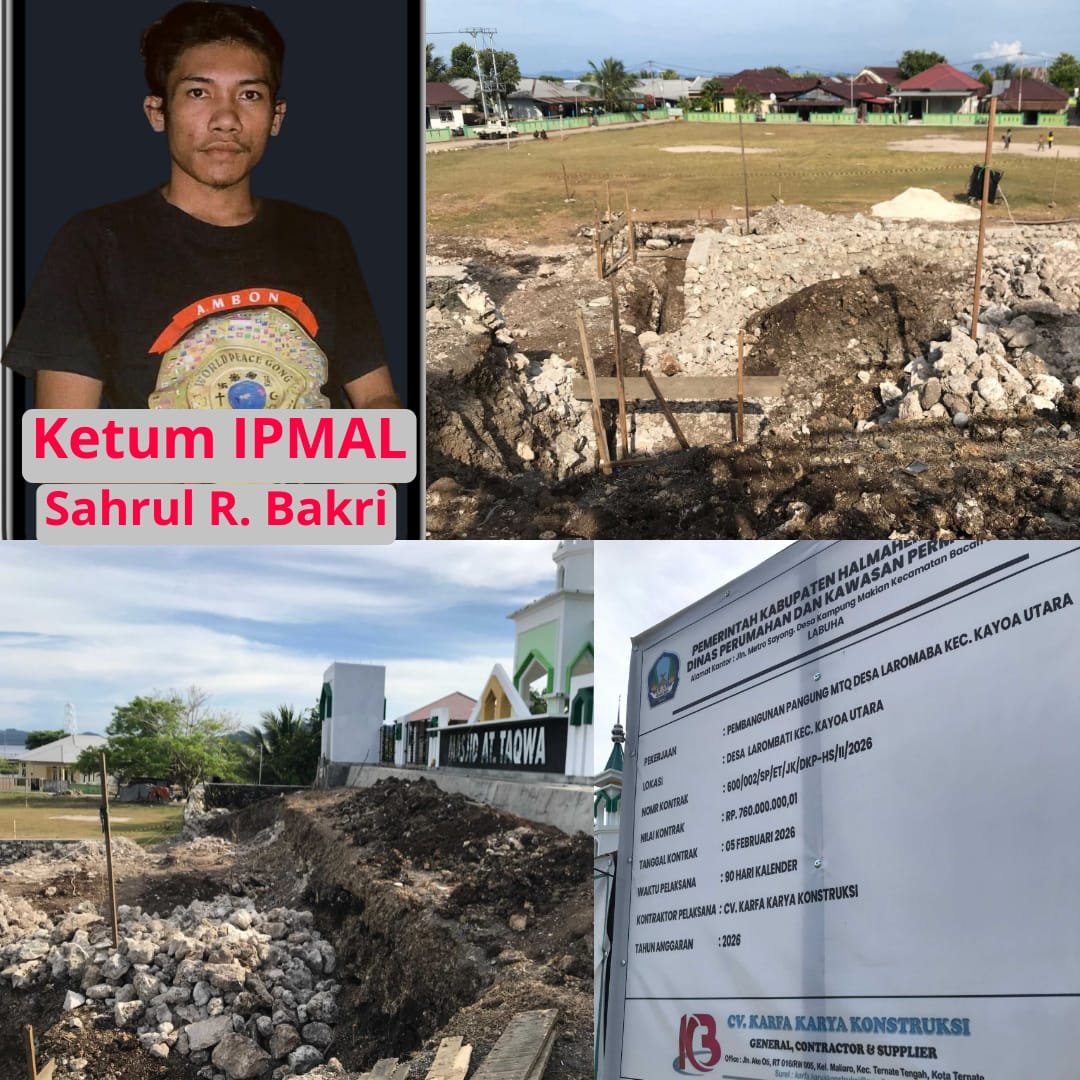 LENTERA MALUTPembangunan panggung Musabaqah Tilawatil Quran (MTQ) Tahun 2026 di Desa Laromabati, Kecamatan Kayoa Utara, Kabupaten Halmahera Selatan, yang semestinya menjadi simbol kemajuan dan kebanggaan masyarakat, kini justru menuai sorotan tajam. Ikatan Pelajar Mahasiswa Laromabati (IPMAL) mengungkap dugaan penggunaan material ilegal dalam proyek tersebut.