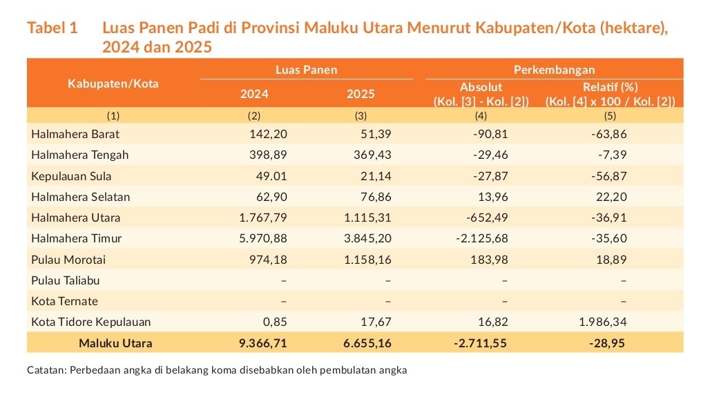 Kepala BPS Maluku Utara menegaskan, data ini menjadi catatan penting bagi seluruh pemangku kepentingan, mengingat sektor padi memiliki peran strategis dalam menjaga ketahanan pangan daerah.