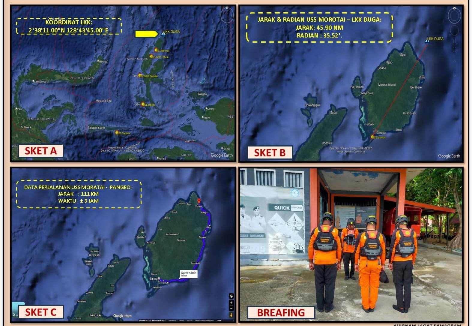 Merespons laporan tersebut, Tim Rescue USS Morotai bersama unsur terkait langsung bergerak menuju lokasi kejadian (LKP) di perairan Desa Loleo Pangeo untuk melaksanakan operasi pencarian dan pertolongan.