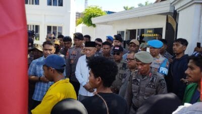 Sejak pukul 13.00 WIT ditengah terik panas matahari para pamong Satpol tampak tegak berdiri menggunakan seragam lengkap di depan pintu gerbang mengamankan aksi demonstrasi peringatan hari buruh.